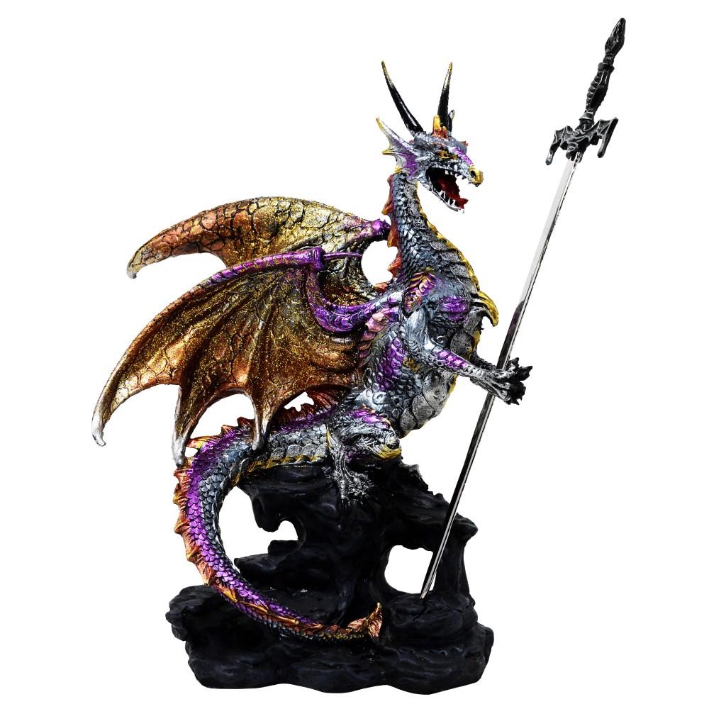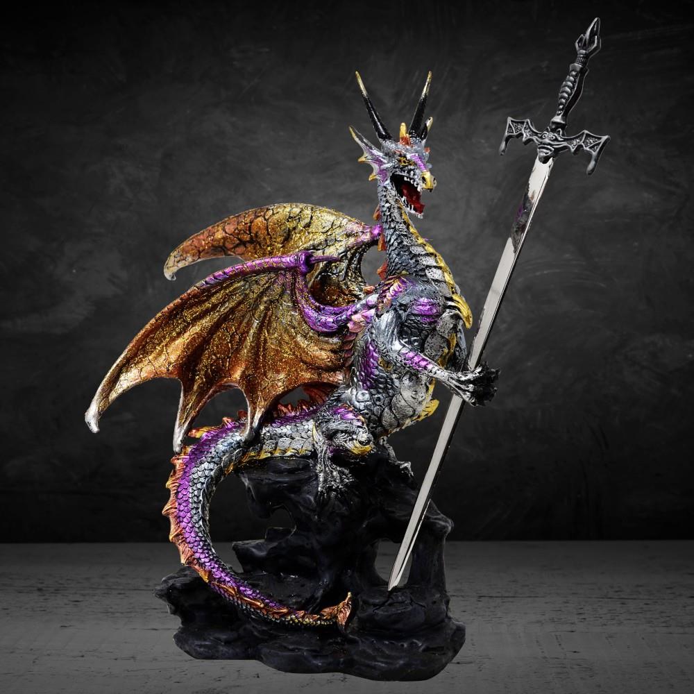 Beautiful and very detailed dragon sitting on a rock, holding a sword
